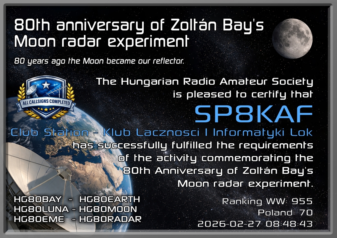 Dyplom Zoltán Bay Moon Radar 80th Anniversary Activity dla SP8KAF