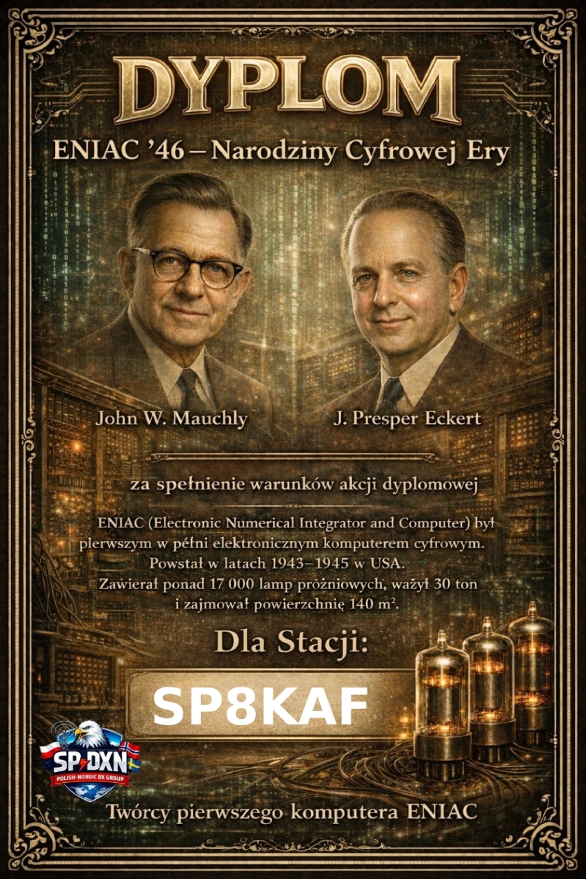 Dyplom akcji "80 lat ENIAC" dla SP8KAF